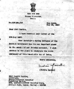 उल्लेखनीय है कि इंदिरा गांधी ने 20 मई 1980 को स्वतंत्र्यवीर सावरकर राष्ट्रीय स्मारक के सचिव पंडित बाखले को संबोधित करते हुए लिखी चिट्ठी में सावरकर के सवतंत्रता आंदोलन में योगदान का जिक्र किया था। इंदिरा ने लिखा था कि वीर सावरकर का ब्रिटिश सरकार के खिलाफ मजबूत प्रतिरोध हमारे स्वतंत्रता आंदोलन में एक विशेष स्थान रखता है। वे देश के महान सपूत के शताब्दी समारोह के आयोजन के लिए बधाई देती हैं।